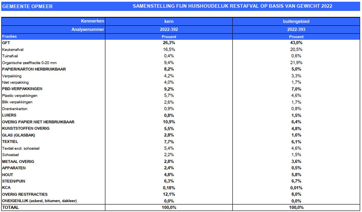 Niet iedere partij restafval wordt uitgebreid gecontroleerd op grondstoffen; dit is ingewikkeld en tijdrovend. Echter biedt het analyseren van de grondstoffen wel een zeer goede inkijk in waar er nog winst te behalen valt in het scheiden van afval. In onderstaande tabel staan de resultaten van de analyse. Deze resultaten bieden een belangrijk inzicht in welke servicemaatregelen effectief kunnen zijn voor gemeente Opmeer.