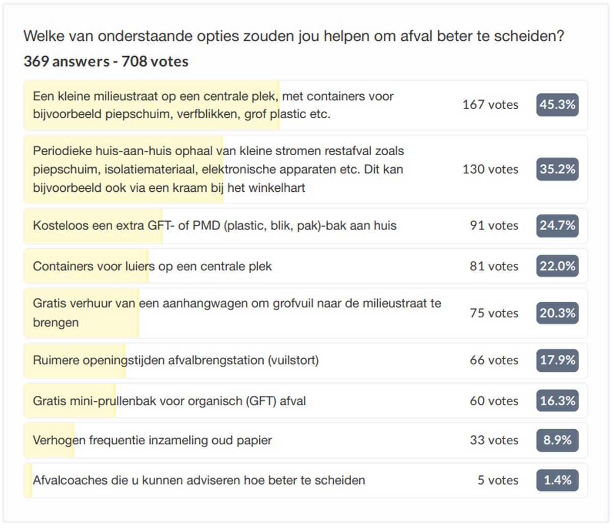 Een van de vragen was een multiple choice vraag, met een aantal mogelijke servicemaatregelen die inwoners kunnen helpen bij het beter scheiden van afval. De volgende opties worden het populairst bevonden: