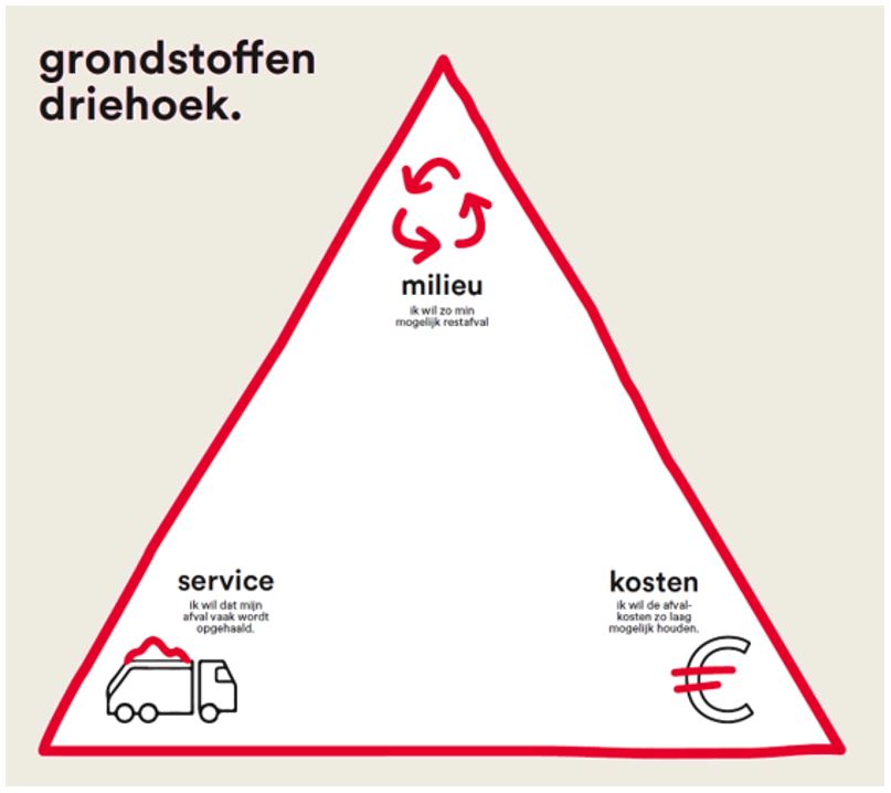 Met de voorliggende koers, zet Opmeer ambitieuze stappen richting een circulaire toekomst. De overtuiging is dat we met deze maatregelen winst kunnen behalen op alle drie de pijlers binnen de grondstoffendriehoek: milieu, kosten en service. Alle maatregelen zijn erop gericht om de kosten zo laag mogelijk te houden, en de milieuwinst zo hoog mogelijk. Dit bereiken we door te sturen op serviceoptimalisatie. De servicemaatregelen die we willen nemen maken het makkelijker om afval te scheiden, en zijn in zijn geheel op zijn minst kostenneutraal. De winst die wordt gemaakt in verlaging van de hoeveelheid restafval en de verhoging van het percentage gescheiden grondstoffen, heeft een verlagend effect op de kosten.