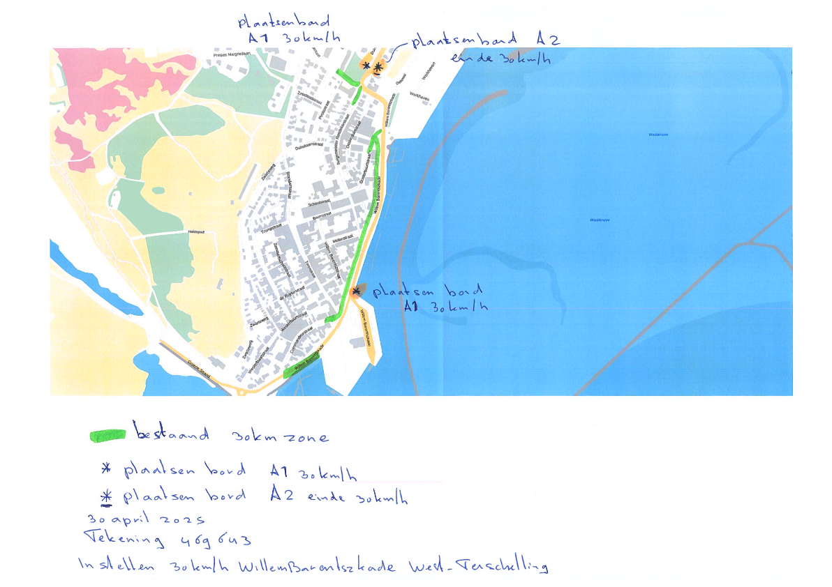 De maximumsnelheid van de straat Willem Barentszkade te West-Terschelling vanaf 6 mei 2025 te beperken tot 30 km/h. Dit door het plaatsen van twee keer verkeersbord RVV A01 (30 km/h) en één keer verkeersbord RVV A02 (einde 30 km/h) zoals aangegeven op tekening 469643, 30 april 2025.