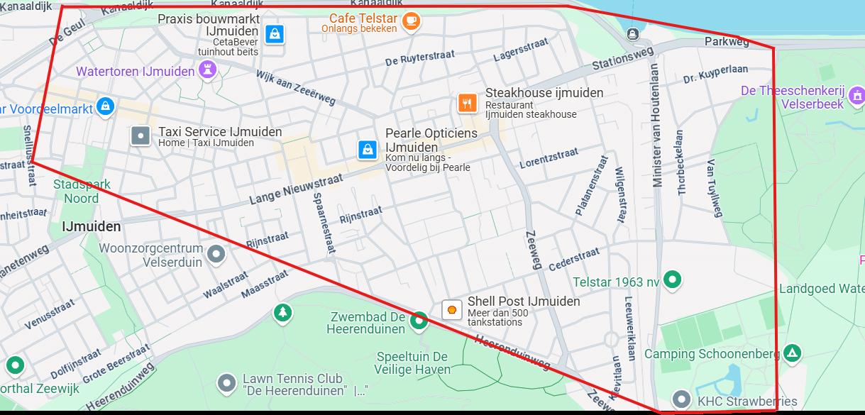 Het gebied rondom het SC Telstar stadion (Minister van Houtenlaan 123), startend op de Parkweg ter hoogte van de Van Tuyllweg overgaand in de Kanaaldijk tot aan Steigerweg 10, vanaf de Steigerweg loopt het gebied tot aan de kruising Snelliusstraat/Marconistraat via de Heerenduinweg overgaand in de Zeeweg via de Minister van Houtenlaan tot aan de Driehuizerkerkweg en van daaruit richting de Parkweg, zoals aangegeven op de bijgaande plattegrond (bijlage 1) die hoort bij dit besluit aan te wijzen als veiligheidsrisicogebied.