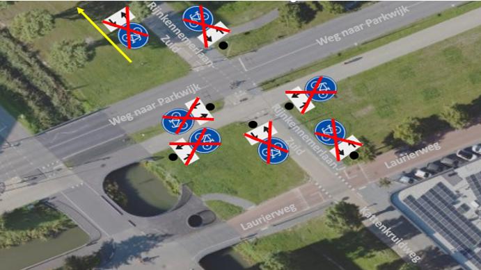 ten einde de juridische situatie overeen te laten komen met de feitelijke situatie de huidige aanduidingen van de fietspaden op de Rijnkennemerlaan-Zuid en Weg naar Parkwijk ingetrokken worden en bij aparte verkeersbesluiten hernieuwd worden vastgesteld;