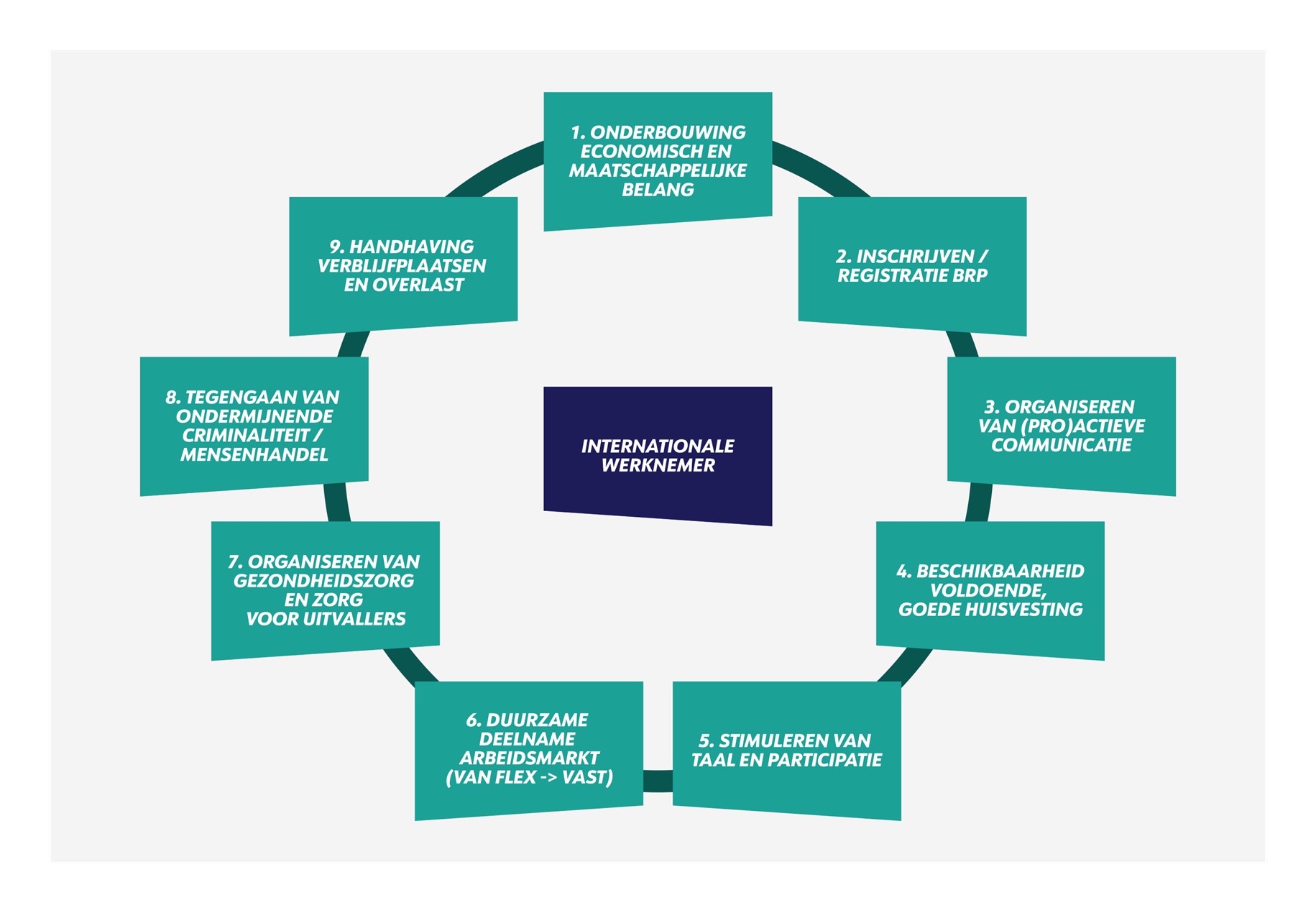 Dit beleidskader is onderdeel van de 9-sporen aanpak van de gemeente Venlo. De 9 sporen aanpak zorgt voor een integrale benadering van vraagstukken rondom internationale werknemers. Keuzes op het ene beleidsterrein hebben immers effecten op andere beleidsterreinen. De 9 sporen zijn in onderstaande figuur weergegeven. Huisvesting is de uitwerking van spoor 4.