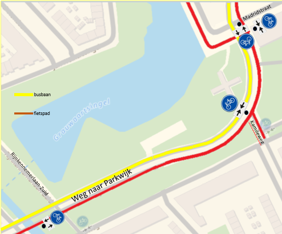 Weg naar Parkwijk (ter hoogte van de Korianderstraat (G11 OB505), tegenover de KamillewegG11 OB503, tegenover het fietspad van de Grauwaartsingel (G11 OB503 en ter hoogte van de Madirdstraat (G11 OB505; wegvak tussen Korianderstraat en Madridstraat)
