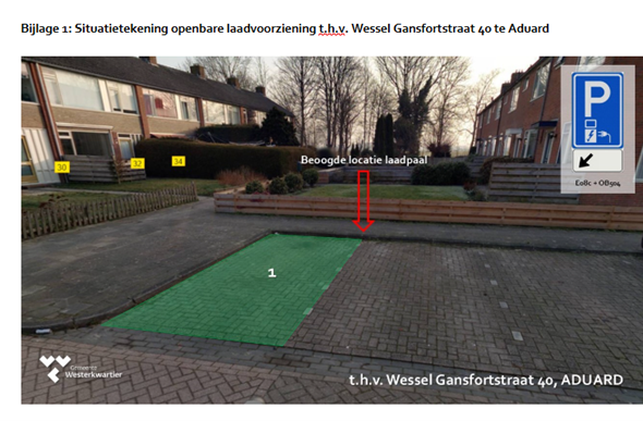 - dat het gaat om één laadpaal (met twee oplaadaansluitingen) op het openbare parkeerterrein t.h.v.Wessel Gansfortstraat 40 te Aduard;