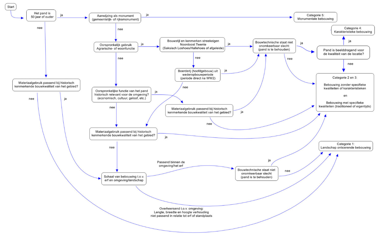 Het uitgangspunt van dit kader en het beleid waarop dit kader gebruikt wordt is het verhogen van de ruimtelijke kwaliteit en het stimuleren van het in stand houden van historisch relevante bebouwing. Deze bebouwing draagt bij aan de kwaliteit, herkenbaarheid en beleefbaarheid van het gebied Noordoost Twente en haar historie. Authenticiteit van de buitenzijde is hierin belangrijk, zowel in materiaalgebruik als in opbouw en vormgeving. Het interieur is in de bepaling van categorisering ondergeschikt.De toetsing is maatwerk per gebouw. De gemeente kan zich bij het bepalen van de categorisering laten adviseren door het Q-team en/of de stadsbouwmeester.