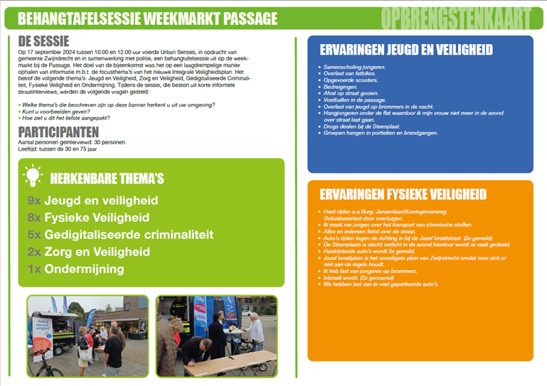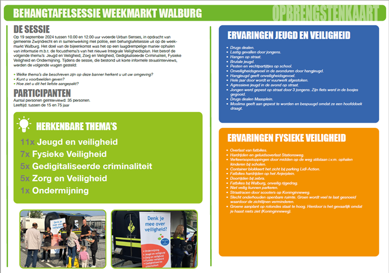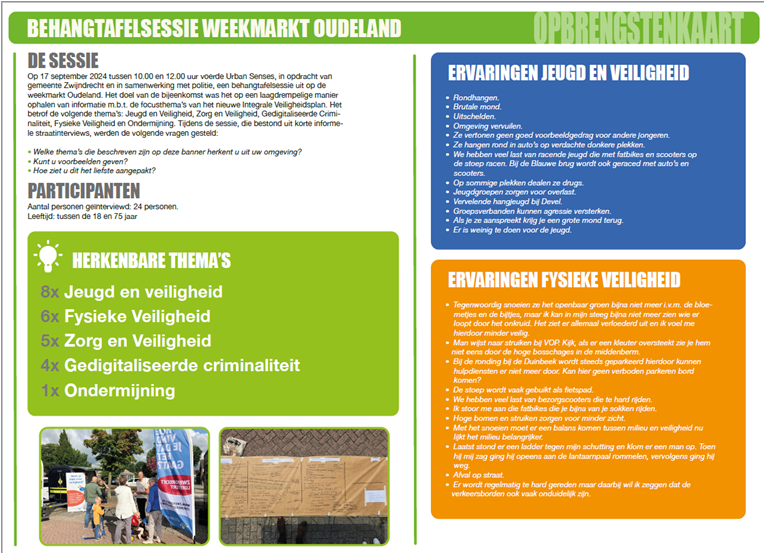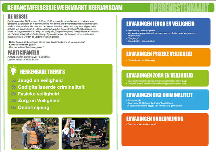 Op 17, 18 en 19 september zijn we op verschillende locaties met onze inwoners in gesprek gegaan. Tijdens deze zogenaamde behangtafelsessies (resultaten uit het gesprek werden letterlijk op een rol behang en behangtafel geschreven) werden inwoners in een open gesprek gevraagd wat zij ervaren op het gebied van veiligheid. In onderstaande afbeeldingen zijn de resultaten weergegeven.