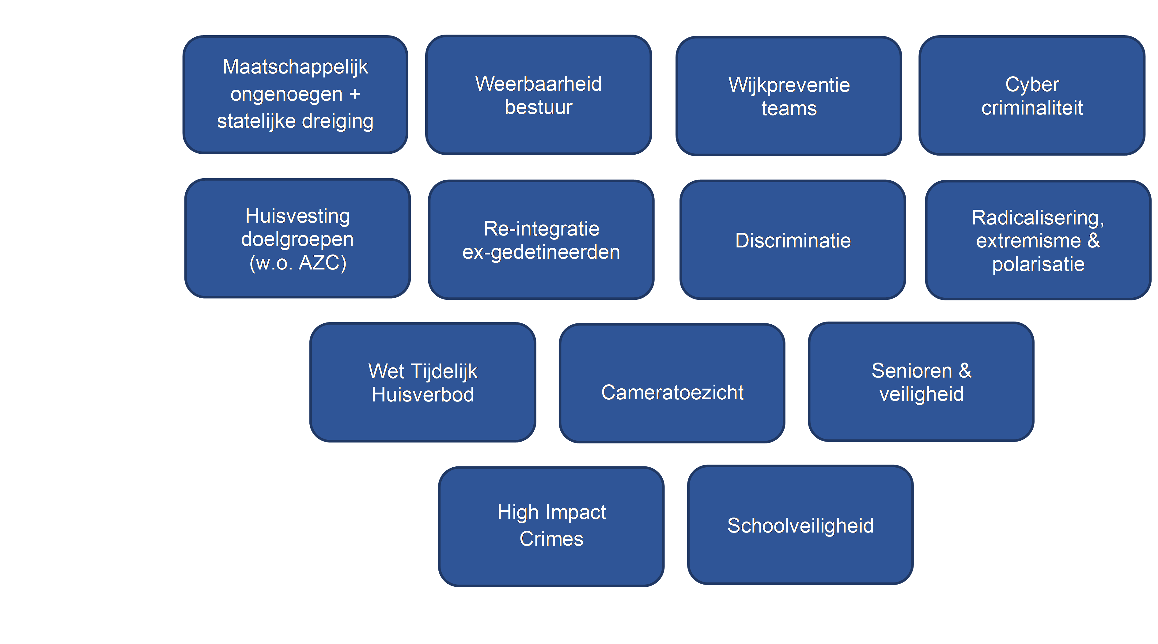 In dit IVP zijn vier thema's opgenomen die wij in de periode 2025-2030 prioriteit geven. Per thema wordt beschreven wat we willen bereiken en hoe we dat gaan aanpakken. De focus voor de periode 2025-2030 ligt op de thema's Ondermijning, Jeugd & Veiligheid, Zorg & Veiligheid en Fysieke Veiligheid.