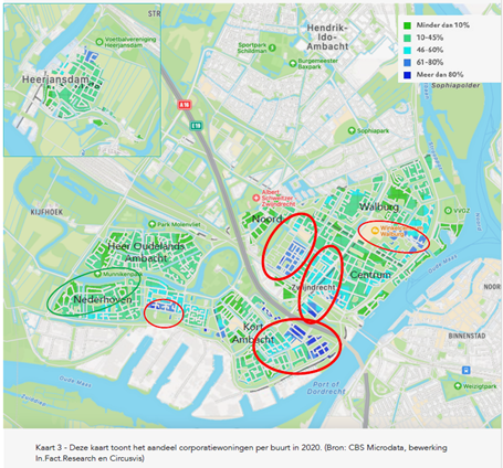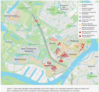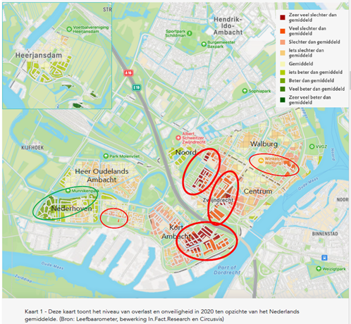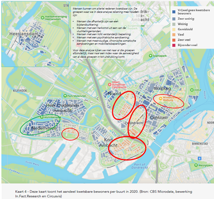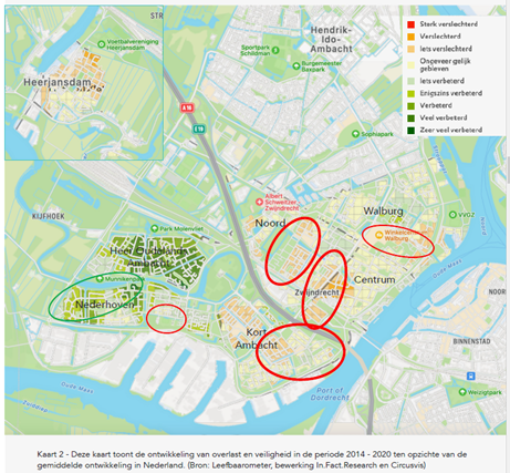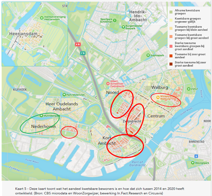 In deze analyse zijn gegevens als onder andere huurderspopulatie, percentage woningen in corporatiebezit, ontwikkeling overlast en onveiligheid en de ontwikkeling van kwetsbare groepen in Zwijndrecht meegenomen. Op basis van deze analyse zien we dat grote delen van de wijken Kort Ambacht, Noord en centrum (veel slechter) scoren dan gemiddeld als het gaat om overlast en onveiligheid. Voor de wijken Nederhoven en Walburg geldt dat voor ene kleiner gebied. Diezelfde conclusie geldt voor de ontwikkeling van overlast en onveiligheid in de afgelopen jaren (2014-2020). Voor de ze wijken geldt ook dat het aandeel woningen in corporatiebezit hoger is dan gemiddeld. Wanneer er vervolgens gekeken wordt naar de verdeling van kwetsbare inwoners zien we dat zij juist in deze wijken meer dan gemiddeld vertegenwoordigd zijn. Dit beeld is eveneens sinds 2014 terug te zien.