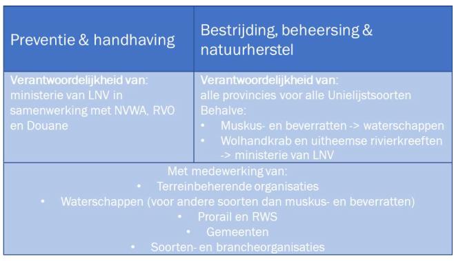 Gedeputeerde Staten zijn verantwoordelijk voor het opstellen en uitvoeren van beleid voor invasieve uitheemse soorten (art. 3.67, lid 1 Bkl) en hebben een coördinerende rol richting uitvoeringspartners (waterschappen, gemeenten, terreinbeheerders, etc.). De invasieve uitheemse dier- en plantensoorten die onder de provinciale taak vallen, zijn vastgelegd in Bijlage 10 van de Regeling natuurbescherming (Rnb). De Rnb is sinds 1 januari 2024 opgegaan in paragraaf 11.2.10 van het Besluit activiteiten leefomgeving (Bal) en afdeling 3.7 van het Besluit kwaliteit leefomgeving (Bkl). De soortenlijst (bijlage 10 Rnb) is over gegaan in bijlage VC van het Bkl. Provincies kunnen ook beleid opstellen met betrekking tot invasieve uitheemse (plaag)soorten die niet op de Unielijst staan (art. 3.67, lid 2 Bkl). De Rijksdienst voor Ondernemend Nederland (RVO) en de Nederlandse Voedsel- en Warenautoriteit (NVWA) voeren namens het ministerie LNV toezicht en handhaving uit.