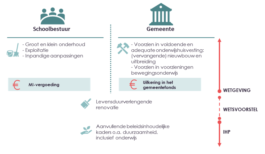 De gemeenten Bergen, Gennep en Mook en Middelaar zijn wettelijk verantwoordelijk voor het voorzien in voldoende en adequate huisvesting van scholen met (vervangende) nieuwbouw en uitbreiding. Schoolbesturen zijn verantwoordelijk voor het groot en klein onderhoud, de exploitatie en inpandige aanpassingen en worden hiervoor vergoed. Figuur 1 geeft weer wat in de huidige wetgeving is bepaald.