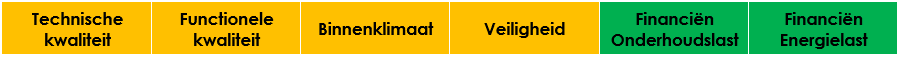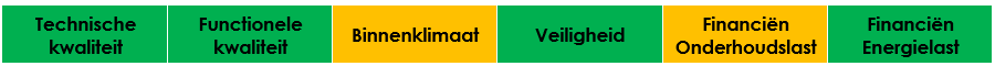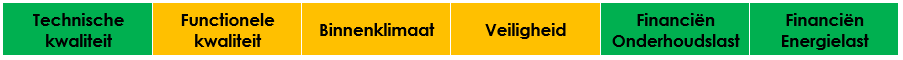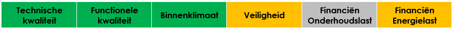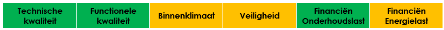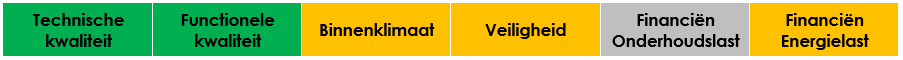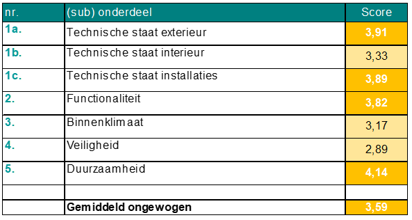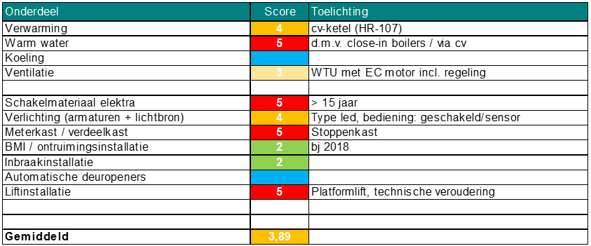 De technische staat wordt beoordeeld op het exterieur (gevels, puien, hang- en sluitwerk en dak), interieur (vloeren, wanden, plafond en sanitair) en installaties (verwarming, koeling, ventilatie, elektrotechnisch en warm water).