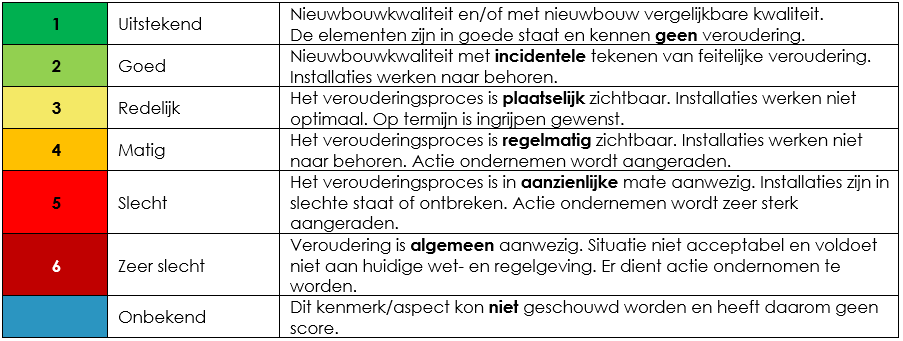 De beoordeling van alle kenmerken of aspecten vindt plaats op een zespuntschaal zoals in onderstaande tabel weergegeven. Wanneer het niet mogelijk is één of meer van de kenmerken/aspecten te schouwen, worden deze als onbekend verklaard en zullen daarom ook geen score krijgen.