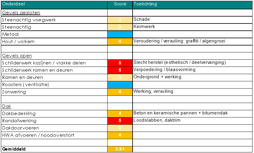 Het gebouw is visueel beoordeeld op vijf hoofdonderdelen, waarvan het hoofdonderdeel “technische staat” is opgebouwd uit drie subonderdelen. Alle (sub)onderdelen zijn beoordeeld op vijf kenmerken of aspecten.