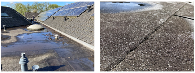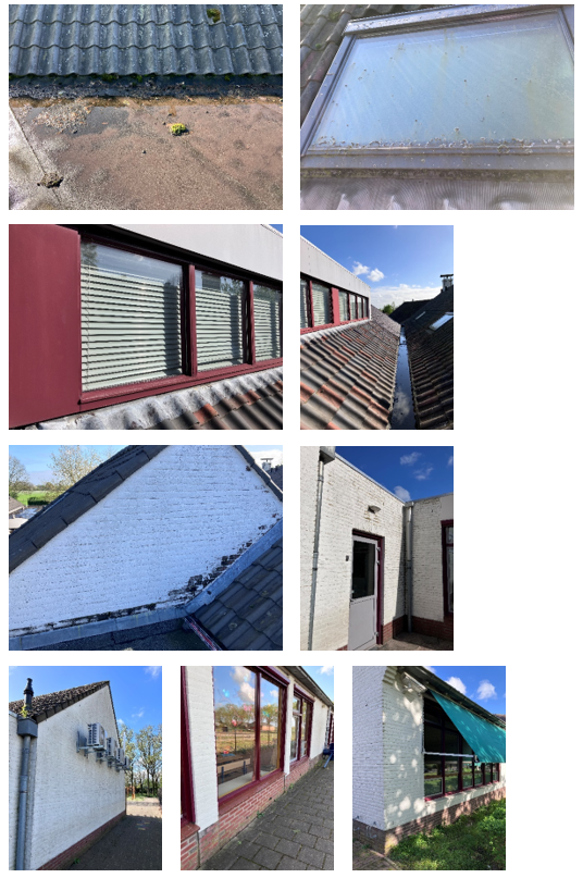 De technische staat van het exterieur is matig. Er is plaatselijk sprake van mosgroei op de gevel (metselwerk). De dakbedekking loopt niet overal goed af en op sommige plaatsen is er spraken van blaasvorming. Op de meeste plaatsen zijn de kozijnen uitgevoerd in aluminium. Deze kozijnen zijn sterk verkleurd door de inwerking van de UV-straling. De kozijnen bij de dakuitbouw zijn uitgevoerd in hout. Het schilderwerk op deze kozijnen is zeer slecht en dient vervangen te worden om verdere schade aan de kozijnen te voorkomen.