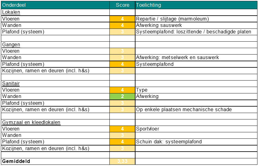 Op het moment van opstellen van dit IHP wordt het gebouw technisch als goed beoordeeld. De functionaliteit en het binnenklimaat (na plaatsing van de ventilatie-units) worden als redelijk beoordeeld. De veiligheid wordt als matig beoordeeld.