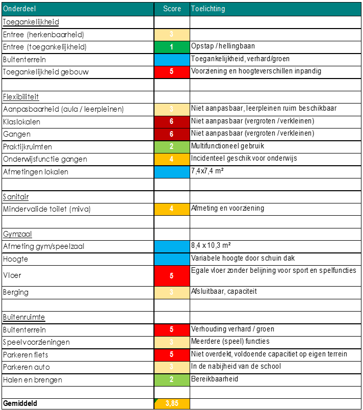 De functionaliteit van het gebouw wordt op vijf aspecten beoordeeld: toegankelijkheid, flexibiliteit, sanitair, gymzaal en buitenruimte.