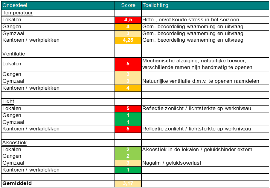 Tijdens de schouw is het binnenklimaat beoordeeld op de onderdelen: temperatuur, ventilatie, licht en akoestiek.