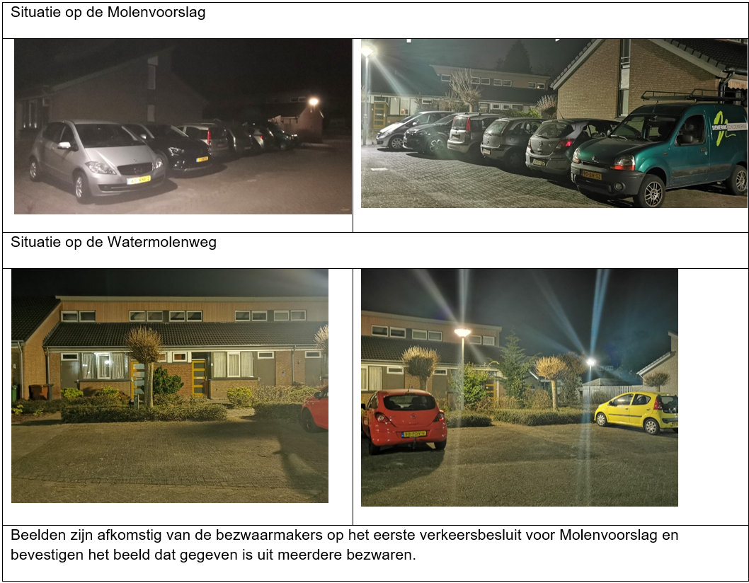 de strekking van deze signalen is dat de Molenvoorslag op dit moment nog niet geschikt is en dat locatie op de Watermolenweg gezien wordt als een betere locatie en dan ook eerst in aanmerking dient te komen. De locatie Watermolenweg wordt gezien als een betere locatie omdat hier over het algemeen niet alle parkeerplaatsen bezet zijn en op de Molenvoorslag wel. Zie hiervoor de sfeerbeelden van de parkeerdruk in bijlage 3. Eveneens kwam in de signalen naar voren dat voorlopig door de bewoners aan de Molenvoorslag niet de overstap gemaakt zal worden naar een elektrisch voertuig;