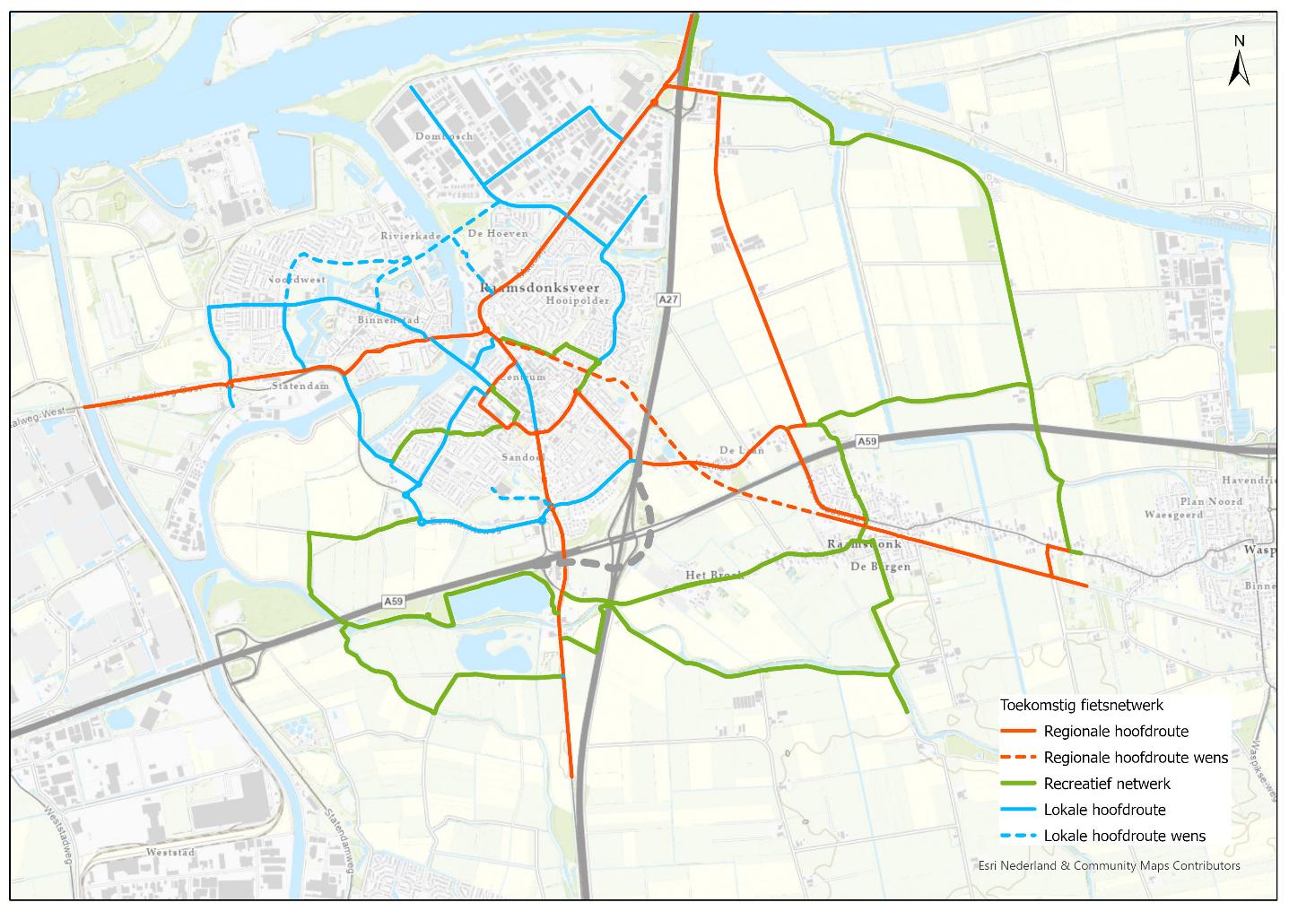 Afbeelding 4 geeft het gewenste fietsnetwerk van Geertruidenberg weer. Er is onderscheid gemaakt regionale- en lokale hoofdroutes en recreatieve routes. Hoofdroutes zijn belangrijke verbindingen voor bijvoorbeeld woon-werkverkeer en schoolverkeer. Recreatieve fietsroutes zijn aantrekkelijke routes om er met de fiets op uit te gaan. Hoofdfietsroutes kunnen recreatieve fietsroutes overlappen. In dat geval worden in afbeelding 4 alleen de hoofdfietsroutes getoond.