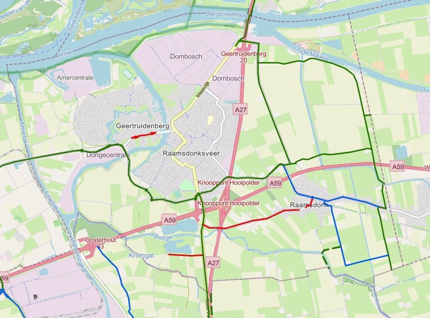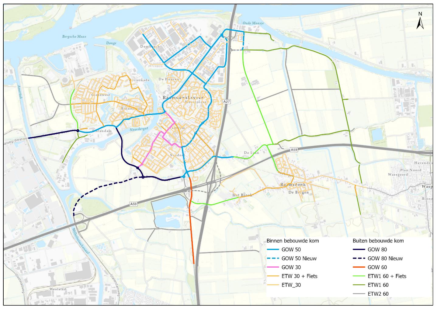 De ontwikkelingen rond de A27 zorgen voor wijzigingen in het wegennetwerk van Geertruidenberg. De aansluiting 34 (Raamsdonksveer) A59 komt te vervallen. Daarvoor in de plaats komt een nieuwe verbinding tussen Raamsdonksveer en aansluiting 33 (Oosterhout) A59. Door deze wijziging in de aansluiting op de A59 ontstaan er andere verkeersstromen in de gemeente. De nieuwe situatie vraagt om een herijking van de wegcategorisering. De gewenste wegcategorisering voor Geertruidenberg is weergegeven in afbeelding 5. Hierin is onderscheid gemaakt in gebiedsontsluitingswegen (GOW) en erftoegangswegen (ETW) binnen en buiten de bebouwde kom. Voor elk type van deze wegen zijn inrichtingskenmerken opgenomen in de tabel in bijlage 2. Deze kenmerken gelden als basis. Voor de verdere detaillering zijn de landelijke richtlijnen van CROW van toepassing. De wegen die ook een functie hebben als hoofdfietsroute zijn in de afbeelding met de wegcategorie ‘+fiets’ aangeduid.