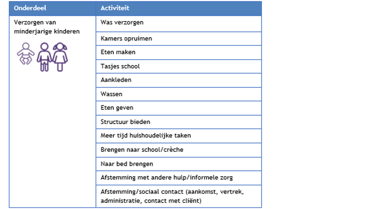 De zorgplicht van ouders voor hun kinderen strekt zich uit over opvang, verzorging, begeleiding en opvoeding die een ouder (of verzorger), onder meer afhankelijk van de leeftijd en verstandelijke ontwikkeling van het kind, normaal gesproken geeft aan een kind, inclusief de ‘zorg’ bij kortdurende ziekte. Bij uitval van één van de ouders neemt de andere ouder de gebruikelijke hulp/zorg voor de kinderen over. Gebruikelijke hulp/zorg voor kinderen omvat in ieder geval de aanwezigheid van een verantwoordelijke ouder of derde persoon, die past bij de leeftijd en ontwikkeling van het kind. Het tijdelijk overnemen van de gebruikelijke hulp/zorg van de kinderen kan een Wmo-aanspraak zijn, maar structurele opvang van kinderen in beginsel niet.