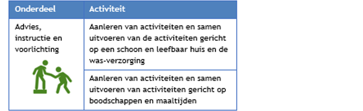 Advies-instructie-voorlichting heeft betrekking op het, op tijdelijke basis, aanleren van praktisch vaardigheden in het huishouden aan een cliënt. Bijvoorbeeld als partner is weggevallen en inwoner het nooit geleerd/gedaan heeft. Het gaat hierbij om maximaal 1 x per week maximaal 90 min.