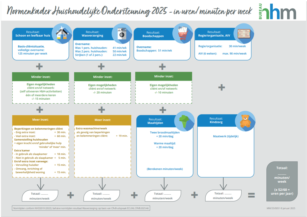 In het normenkader van bureau HHM wordt per onderdeel de frequentie en/of de benodigde tijd genoemd dat toegekend kan worden. Iedere individuele situatie wordt separaat onderzocht en als die situatie erom vraagt dan wordt van onderstaande richtlijn afgeweken. De gemeente kan afwijken met zowel op- als neerwaartse bijstellingen. Dit kan alleen als gemotiveerd aangegeven wordt waarom de verhoging of verlaging noodzakelijk is. Voor alles geldt dat als maatwerk vraagt om hiervan af te wijken, dit voorgaat op de richtlijn.