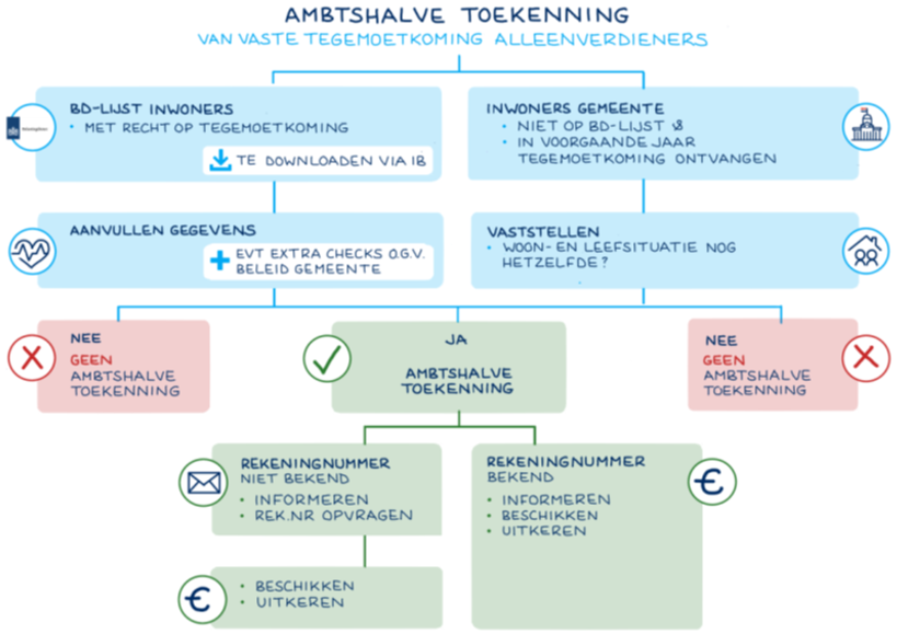 Het Inlichtingenbureau deelt de bij de Belastingdienst bekende Burgerservicenummers van de meestverdienende partner van de betrokken huishoudens via het gegevensportaal met onze gemeente. Huishoudens waarvan onze gemeente het vermoeden heeft dat zij tot de doelgroep behoren kunnen uitgenodigd worden om een aanvraag voor de vaste tegemoetkoming te doen. Huishoudens die zelf het vermoeden hebben tot de doelgroepte behoren kunnen op eigen initiatief een aanvraag doen (zogenaamde zelfmelders).