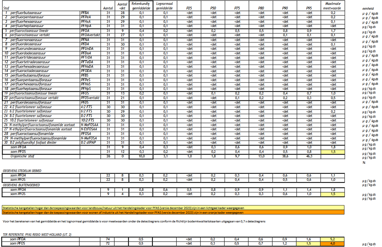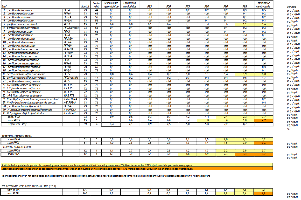 De toepassingswaarden voor landbouw/natuur zijn gebaseerd op de landelijke achtergrondwaarden van PFAS.