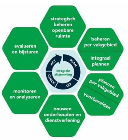 De ambities, organisatiedoeleinden en budgetten worden vertaald in beleidsplannen dan wel zijn vastgelegd in de Nota IBOR 2024-2028. Deze kaders worden gebruikt voor het opstellen van beheer- en uitvoeringsplannen. Met de monitoring wordt getoetst of de gewenste ambitie gehaald wordt. Bij afwijkingen dient er bijgestuurd te worden in prestatie of budgetten. Met als doel tegen aanvaardbare kosten en binnen acceptabele risico’s te beschikken over de juiste prestaties van alle assets in de openbare ruimte gedurende hun totale levenscyclus volgen we de werkwijze “Plan-Do-Check-Act”-cyclus.
