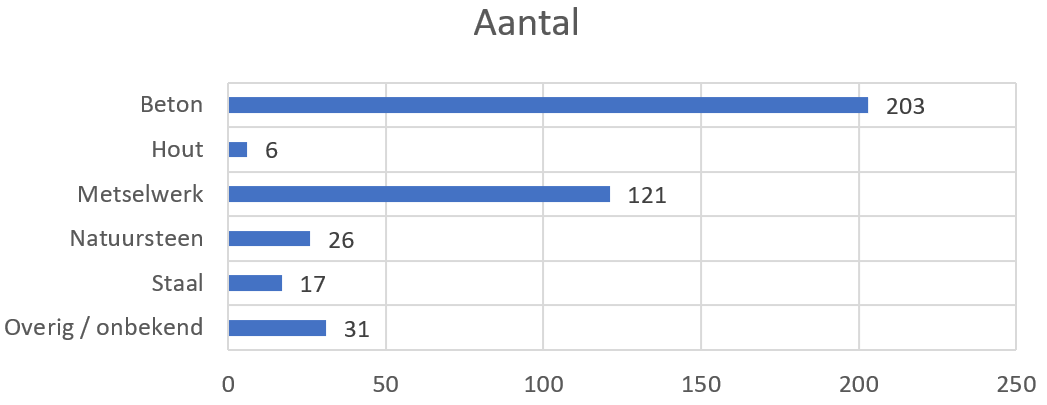 Het areaal civiele kunstwerken van de gemeente Maastricht is eveneens op te delen naar de gebruikte materialen om het kunstwerk te realiseren. Vanuit het oogpunt van beheer is, gezien de onderhoudsbehoefte van materialen, dit belangrijke informatie. De areaalinformatie is, voornamelijk, voor de kleinere objecten nog niet geheel op orde, maar de tabel geeft een goed indicatie van de gebruikte materialen.