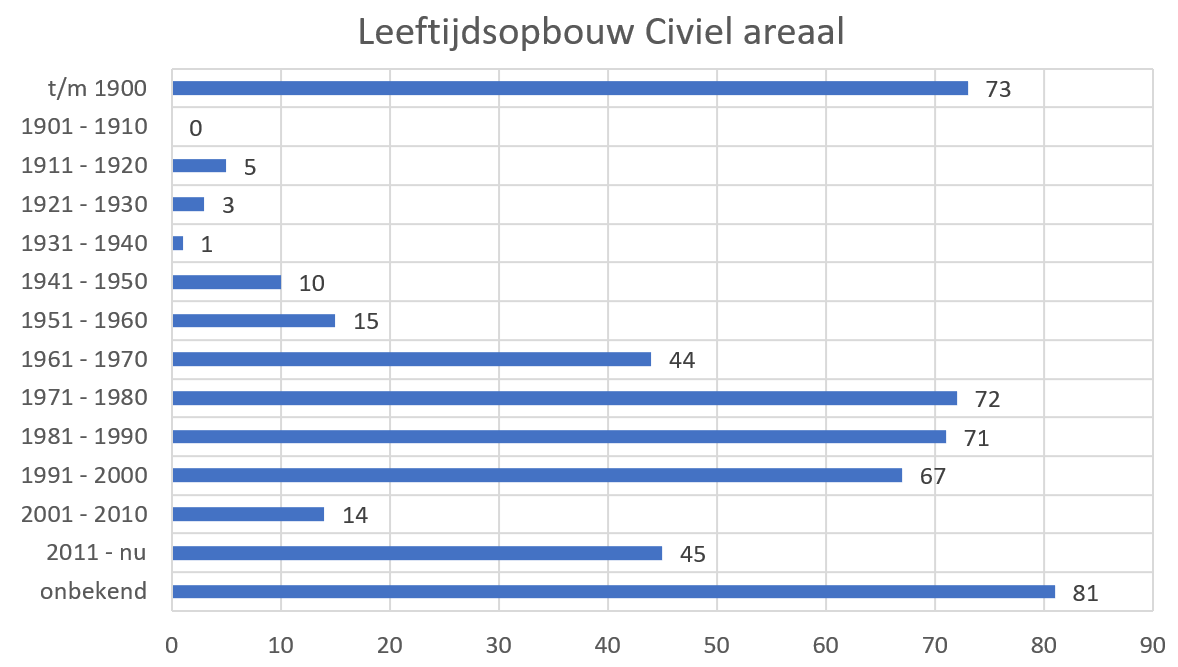 Van het areaal is een opsplitsing gemaakt het bouwjaar van het areaal. In onderstaande tabel is dit weergegeven. Uit oogpunt van beheer vragen oudere objecten over het algemeen meer onderhoudswerk.