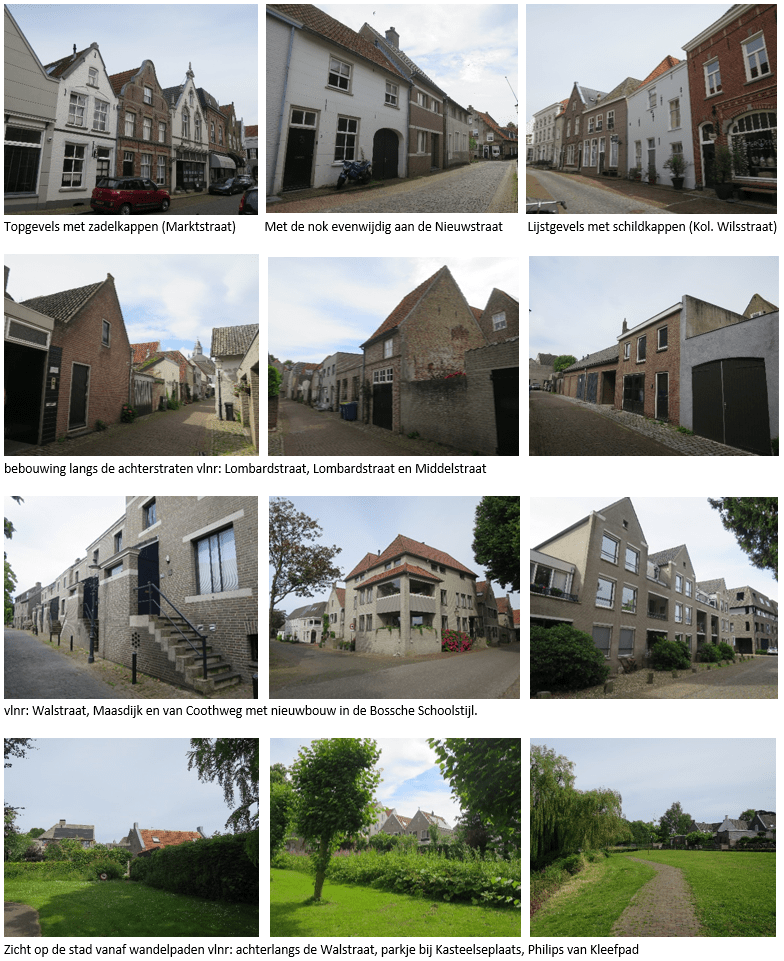 Op plekken waar in de tweede helft van de 20e eeuw verkrotte woningen zijn gesloopt, zijn huizen gebouwd in de stijl van de ‘Bossche school’ of een afgeleide hiervan. Deze nieuwbouw heeft plaatselijk geleid tot een schaalvergroting in het beeld van de stad. Rondom de historische stadskern liggen rustige en onbebouwde gebieden. Deze gebieden bieden een prachtig contrast met de stedelijke bebouwing. Wandelpaden leiden langs verschillende groene plekken, zoals moestuinen, een stadstuin en een begraafplaats. Deze wandelpaden bieden een perspectief op de achterzijde van de bebouwing van de binnenstad.