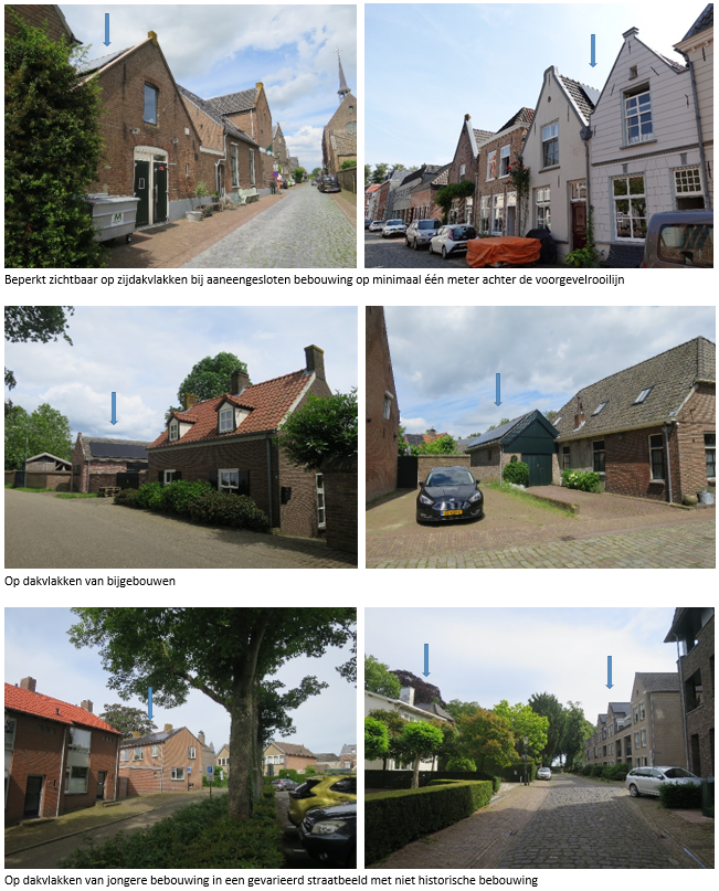 In de voorstraten van Ravenstein is door de aaneengesloten bebouwing het zicht op de daken vanaf openbaar gebied beperkt. Soms is zelfs het voordakvlak niet of nauwlijks zichtbaar. Zijdakvlakken vallen alleen op wanneer het pand op een hoek ligt of wanneer het pand niet wordt omsloten door panden van dezelfde hoogte. De overige zijdakvlakken zijn vrijwel altijd geschikt voor het plaatsen van zonnepanelen. Als uitgangspunt wordt gehanteerd om bij zadelkappen de eerste meter van het dak vanaf de voorgevelrooilijn vrij te houden en bij schildkappen zonnepanelen pas te plaatsen daar waar de nok begint. Dit is ook als zodanig verwerkt op de dakvlakkenkaart. Bij hogere panden in een bouwblok hangt het plaatsingsvoorstel af van de mate van zichtbaarheid en betekenis van het betreffende dakvlak en pand.