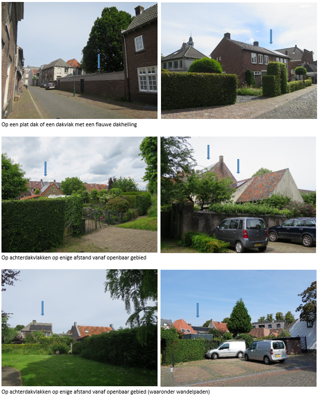 Het wel of niet zichtbaar zijn van zonnepanelen is bij het opstellen van de dakvlakkenkaart niet als generiek uitgangspunt gehanteerd, maar de mate waarin het beeld van het beschermde stadsgezicht wordt verstoord. Wordt er bijvoorbeeld slechts een glimp opgevangen van de zonnepanelen gelegen op een zijdakvlak in het voorbijgaan of bepalen de zonnepanelen op een voordakvlak ook op grotere afstand het straatbeeld?