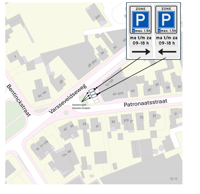 door middel het plaatsen van borden E10 van bijlage 1 van het RVV 1990 waarop een maximale parkeerduur van 1,5 uur is aangeduid, met onderborden met de tekst ‘ma t/m za 09-18 h’ en pijlen waaruit blijkt op welke parkeerplaatsen de parkeerschijfzone van toepassing is, op drie parkeerplaatsen op de Patronaatsstraat t.h.v. no 42 een parkeerschijfzone met een maximale parkeerduur van 1,5 uur in te stellen, van toepassing van maandag t/m zaterdag, van 9.00 uur tot 18.00 uur.