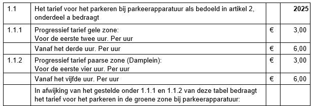 De tarieventabel behorende bij de verordening parkeerbelastingen 2025 wordt vervangen door bijgesloten tarieventabel. De volgende onderdelen in de tarieventabel wijzigen: