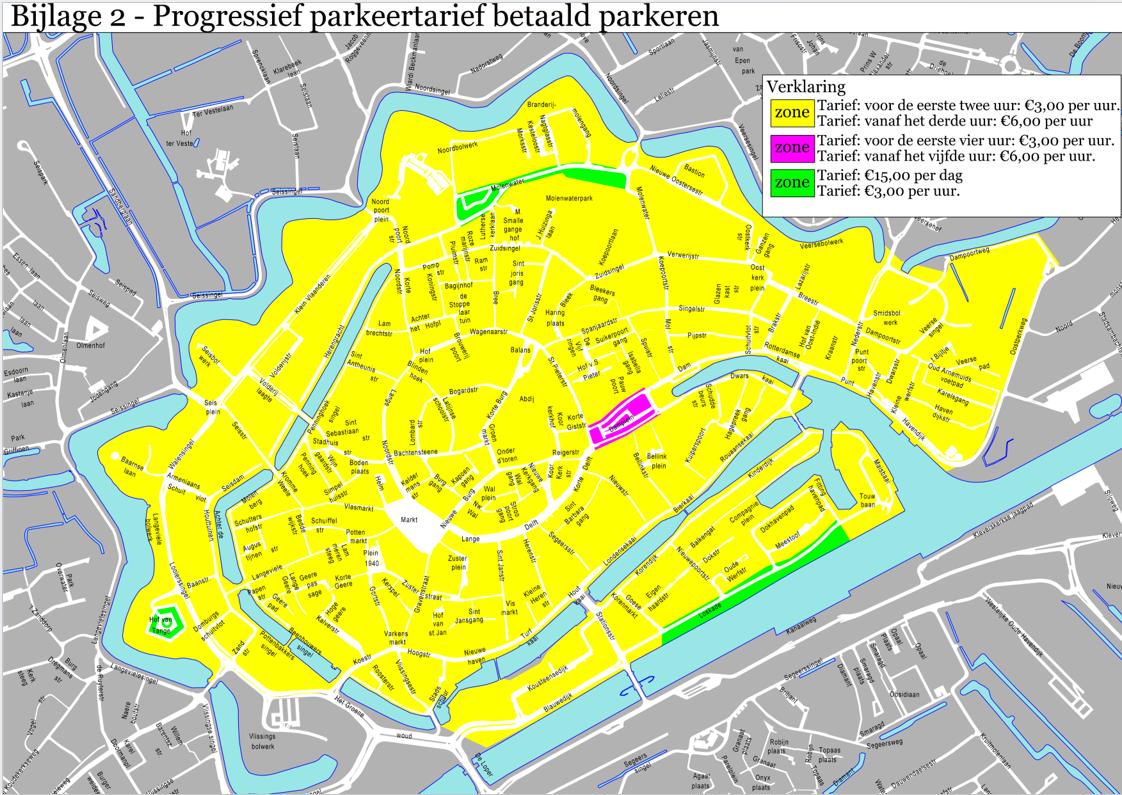 De kaart “Maximum parkeerduur betaald parkeren” behorende bij bijlage 2 “Voorschrift in werking stellen van parkeerapparatuur” wordt vervangen door bijgesloten kaart Bijlage 2 “Progressief parkeertarief betaald parkeren”.