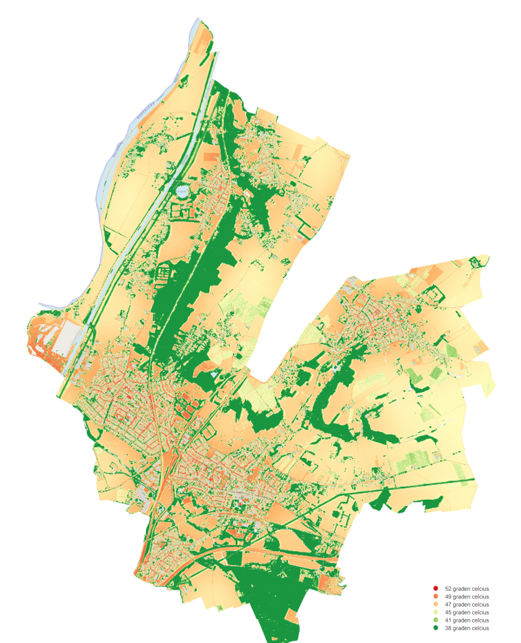 In Figuur 9 is de https://hittestress.nu/Physical Equivalent Temperature (PET/gevoelstemperatuur) kaart weergegeven voor de gemeente Meerssen. Deze kaart toont een warme dag die 1 keer per 1000 zomerdagen voorkomt in het huidige klimaat. Uit deze kaart kan worden geconcludeerd dat de gevoelstemperatuur in het centrum van Meerssen en in de woonwijken van Bunde hoog op kan lopen. Dit zijn onder andere locaties waar scholen, zorgcentra en supermarkten staan. Op deze locaties willen we juist verkoeling voor de kwetsbare groep mensen die zich hier bevinden.