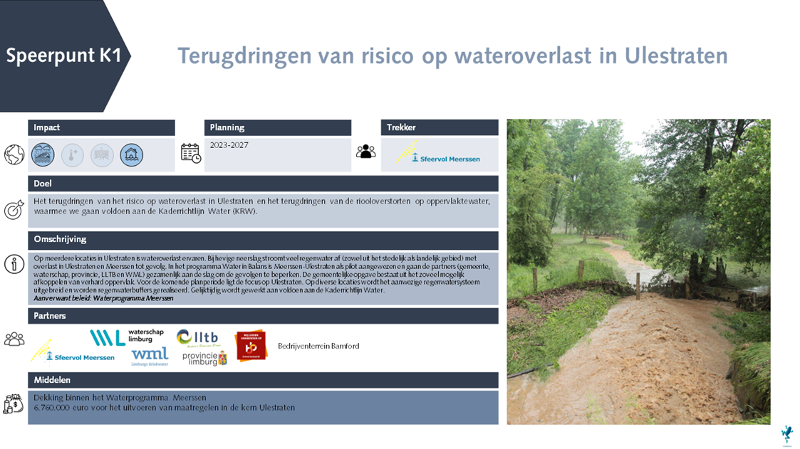 In deze overeenkomst zijn afspraken gemaakt over het treffen van maatregelen om de gevolgen van wateroverlast in Ulestraten en Meerssen zoveel mogelijk te beperken. Het streven is om Meerssen en Ulestraten te beschermen tegen een bui die gemiddeld 1 keer per 25 jaar voorkomt.