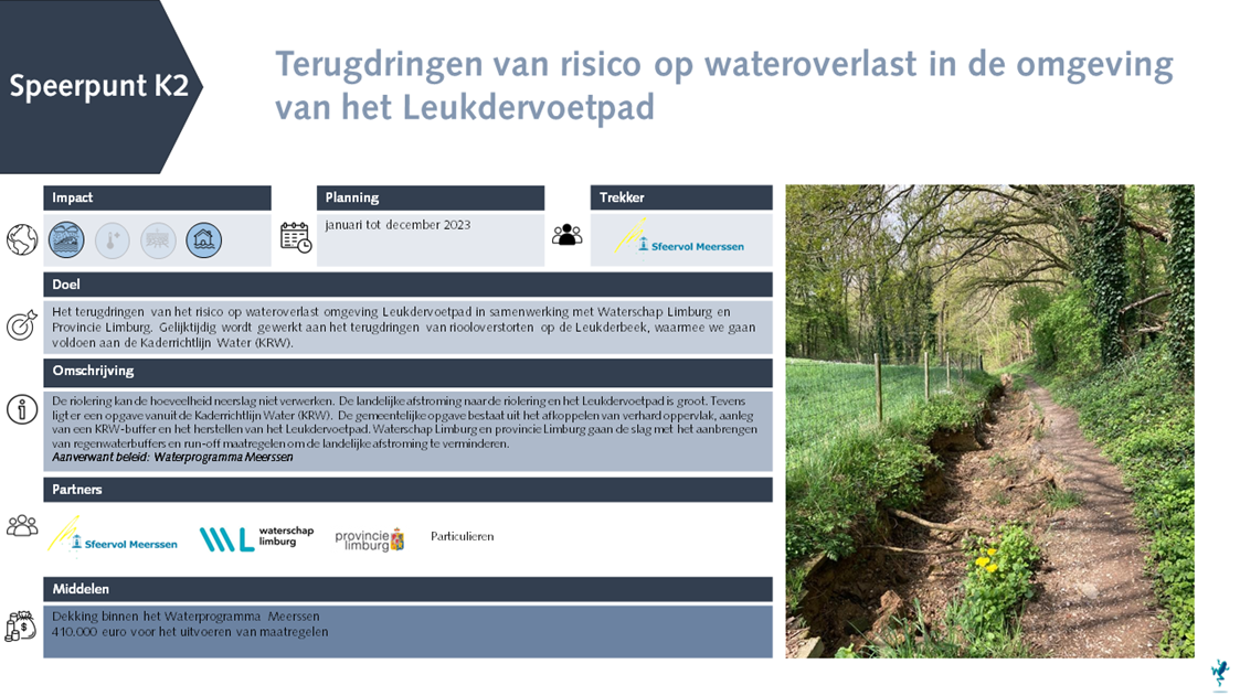 Het terugdringen van risico op wateroverlast in de omgeving van het Leukdervoetpad. We koppelen zoveel mogelijk verhard oppervlak af, leggen een KRW-buffer aan en herstellen het Leukdervoetpad. De provincie en het waterschap leggen regenwaterbuffers aan en passen run-off maatregelen toe om landelijke afstroming te verminderen;