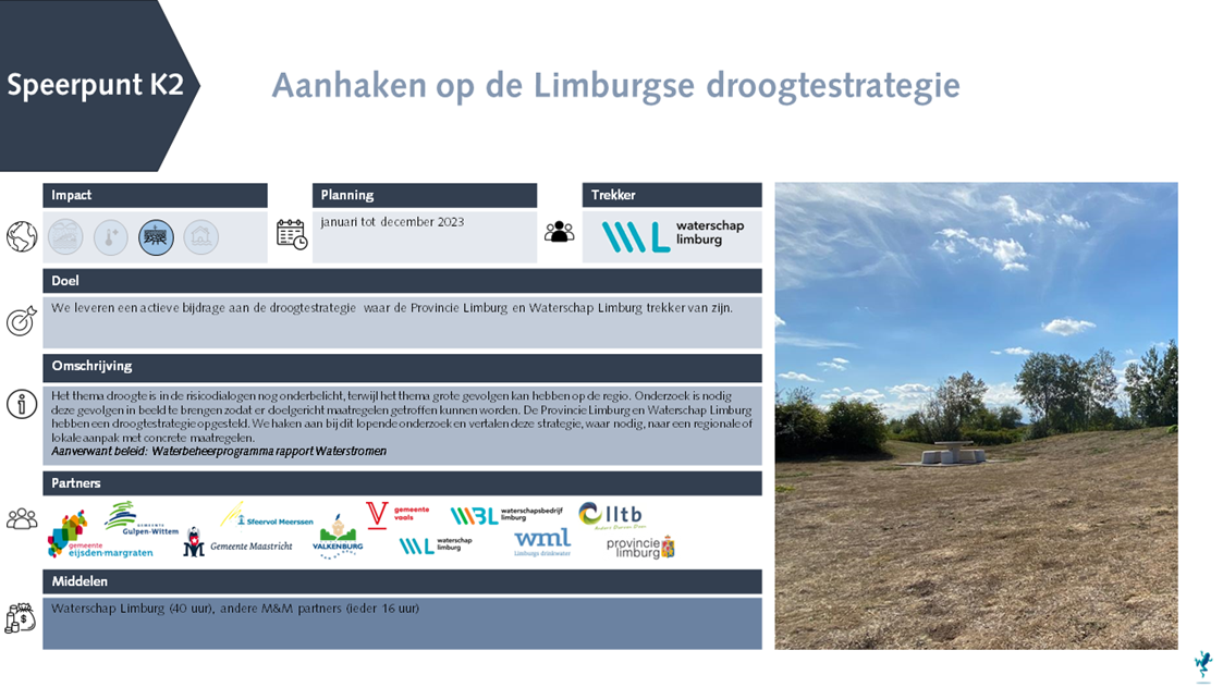 Limburg, gesteund door diverse belangengroepen, de urgentie, de noodzaak en tegelijkertijd de kans om de watersystemen in Limburg versneld klimaatrobuust te maken. Directe aanleiding hiervoor is het extreem hoogwater in juli dat in Limburg tot enorme maatschappelijke, financiële en emotionele schade leidde. Provincie Limburg, de betrokken gemeenten en waterschap Limburg slaan daarom, als overheden in de regio, de handen ineen om het watersysteem in Limburg versneld en integraal aan te pakken. Waar de overheden in de regio de verantwoordelijkheid dragen voor het regionale watersysteem ligt die taak voor het hoofdwatersysteem van de Maas primair bij het Rijk. De voorgestelde aanpak vergt een extra financiële impuls van 1,2 miljard euro om het uitgevoerd te krijgen in 2035 in plaats van in 2050. De Propositie Water Limburg is op 2 november 2021 aangeboden aan het Rijk. Op basis hiervan heeft het Rijk in het regeerakkoord de betrokkenheid bij de opgave vertaald in een reservering van € 300 miljoen voor de aanpak van het regionaal watersysteem. Bovendien wordt vanaf 2026 een bedrag van € 250 miljoen toegevoegd aan het Deltafonds, mede voor het versnellen van de uitvoering van het Deltaprogramma