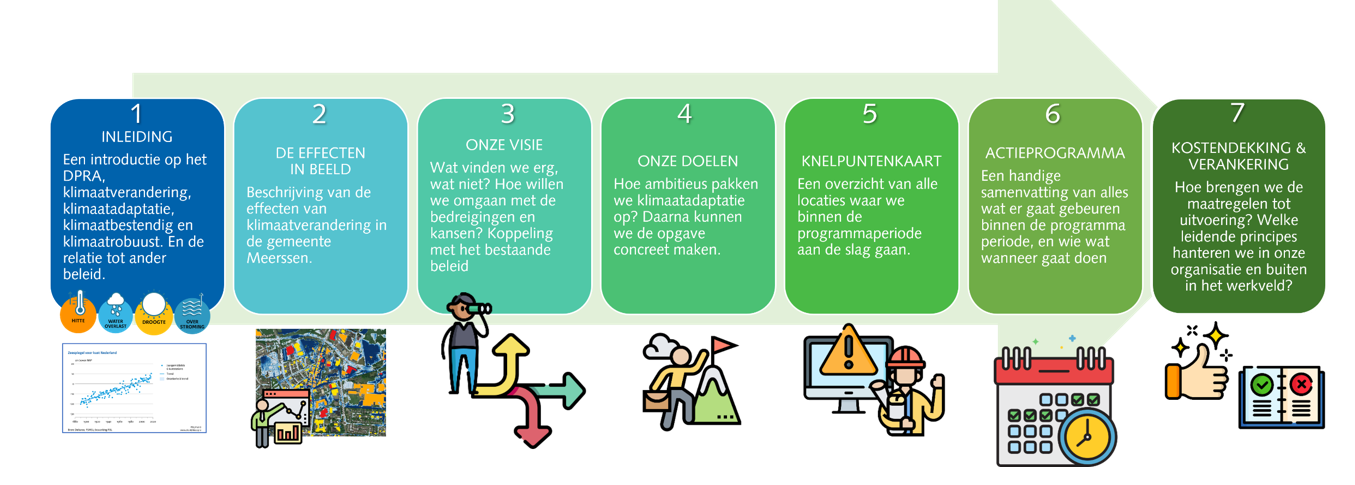 De lokale Klimaatadaptatiestrategie beschrijft de visie, doelen en actieprogramma (op basis van de huidige inzichten) waar de gemeente Meerssen tot 2035 voor aan de lat staat. Alle acties op het actieprogramma hebben prioriteit gekregen om maatregelen binnen de programmaperiode uit te voeren. Klimaatadaptatie doe je samen. Dit plan is daarom opgesteld in samenwerking met verschillende disciplines binnen de gemeente en samenwerkingspartners buiten de gemeente. Voorafgaand aan de lokale Klimaatadaptatiestrategie hebben de partners van het samenwerkingsverband Maas en Mergelland een regionale Klimaatadaptatiestrategie opgesteld. Hierin staan gezamenlijke doelen en acties om de regio voor te bereiden op de gevolgen van klimaatverandering. Parallel aan deze klimaatadaptatiestrategieën hebben we een Waterprogramma opgesteld. Hierin staat beschreven hoe we als gemeente onze gemeentelijke watertaken willen uitvoeren en hoe we die willen bekostigen vanuit de rioolheffing.