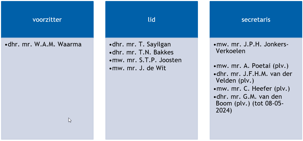 De commissie heeft na 2024 afscheid genomen van lid de heer T.N. Bakkes en verwelkomt de nieuwe leden mevrouw N.A.M. Bergmans en de heer M. Metten.