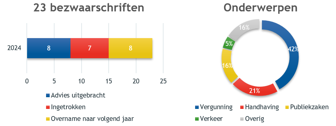In 2024 zijn in totaal 19 bezwaarschriften bij de gemeente Bergeijk ontvangen en is de behandeling van 4 bezwaarschriften overgenomen uit 2023. In 2023 waren 26 bezwaarschriften ontvangen met daarbij 8 uit 2022 overgenomen bezwaarschriften. Daarmee is het aantal ontvangen bezwaarschriften met 27% afgenomen ten opzichte van 2023 en zelfs met 66% ten opzichte van 2022.