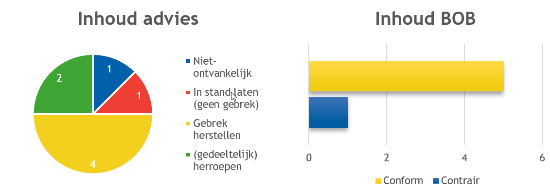 2 beroepschriften (buiten behandeling laten aanvraag; besluit op handhavingsverzoek) zijn ongegrond verklaard (BOB conform advies), 2 beroepschriften (omgevingsvergunning en handhavingsbesluit) zijn gegrond verklaard (BOB conform advies). 1 beroepschrift met betrekking tot een omgevingsvergunning is ongegrond verklaard (BOB contrair aan advies). 1 beroepschrift is ingetrokken.