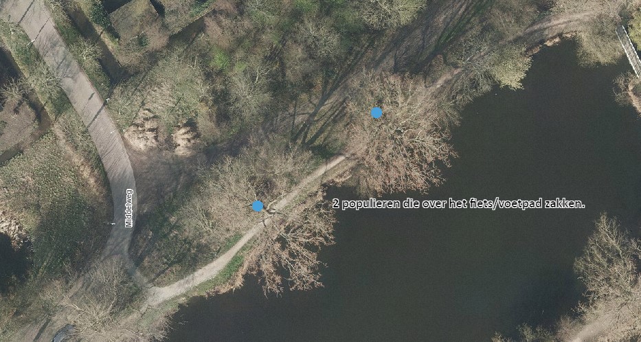 Op 20 mei 2025 is door de groenbeheerder van het stadsdeel Leidschenveen-Ypenburg gecontroleerd en geconstateerd dat langs het fiets-voetpad van de Middelweg twee populieren scheef zakken. Het betreft twee Populus canadensis ‘Marilandica’ met de stamomtrek van 415 en 417 cm. Bij Gemeente Delft, eigenaar van deze bomen, is geattendeerd door bewoners, dat deze bomen steeds schever zakken. Gemeente Delft heeft de stabiliteit van deze bomen laten onderzoeken en het advies gekregen deze bomen binnen 1 maand te kappen. Mocht de boom bezwijken dan kan daarbij schade aan de waterkering ontstaan. Schade aan de kade heeft grote gevolgen voor het achterliggende gebied.