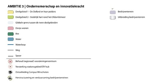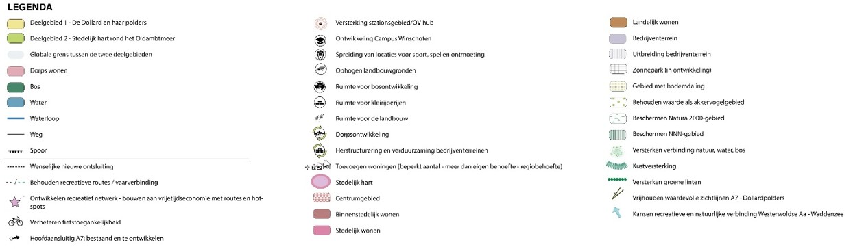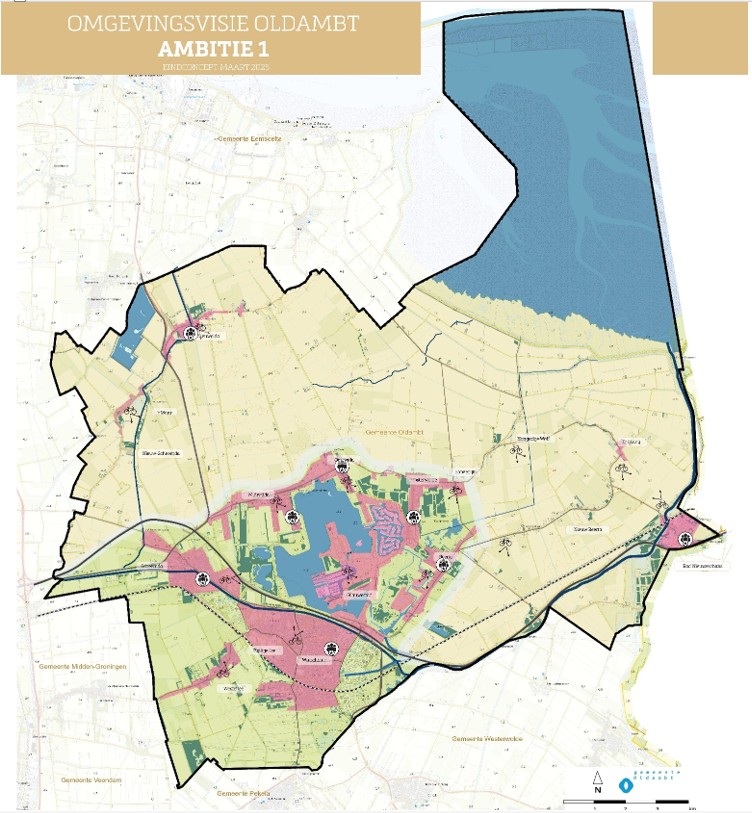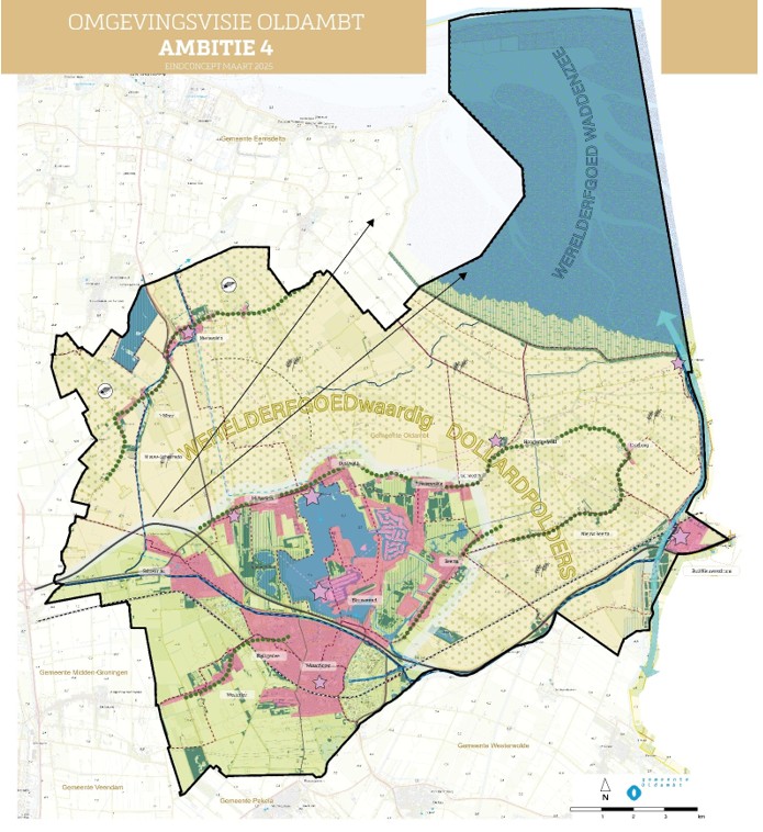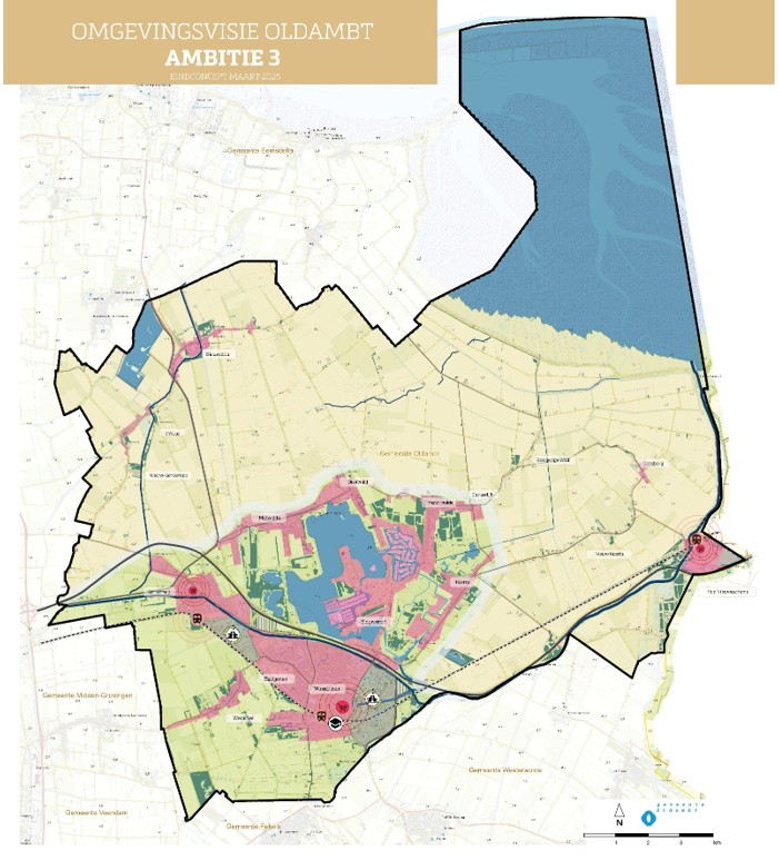 Onze strategische keuzes maken we aan de hand van ambities. Deze integrale ambities geven aan hoe we de ontwikkeling van onze gemeente zien en hoe we daar mee aan de slag gaan. We maken daarbij verschil tussen gebieden. Winschoten heeft immers andere uitdagingen dan bijvoorbeeld Nieuw-Scheemda of Drieborg en elk van onze dorpen heeft zijn eigen karakter en bijzon-derheden. We hebben daarom in onze Omgevingsvisie verschil gemaakt in twee gebieden: het gebied rond het Oldambtmeer en de Dollard en haar polders. Zo doen we recht aan de veelzijdigheid van onze gemeente. De scheidslijnen tussen de gebieden zijn overigens globaal en dienen geen ander doel dan het bovenstaande.