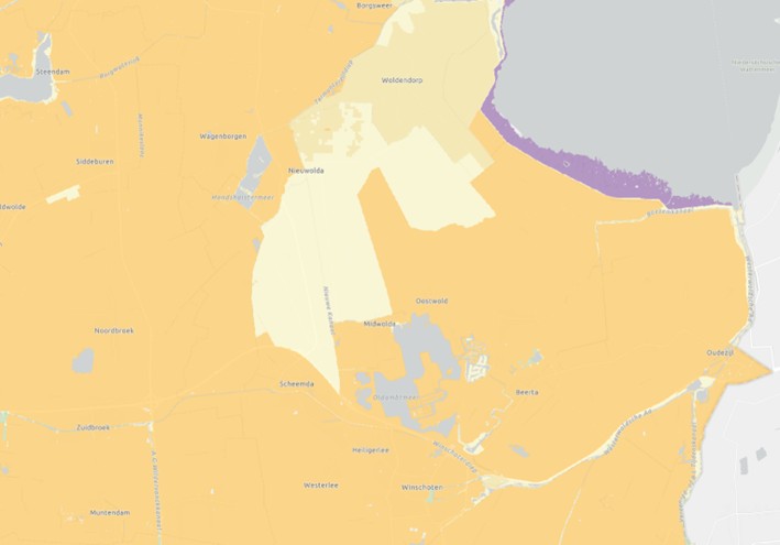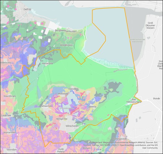 De polders met de kleigronden (groen) en het schiereiland van Oldambt waar de bodem vooral uit zand (geel/bruin/roze) en veen (paars) bestaat of een combinatie van zand-, veen- en kleilagen (bron: Atlas leefomgeving)